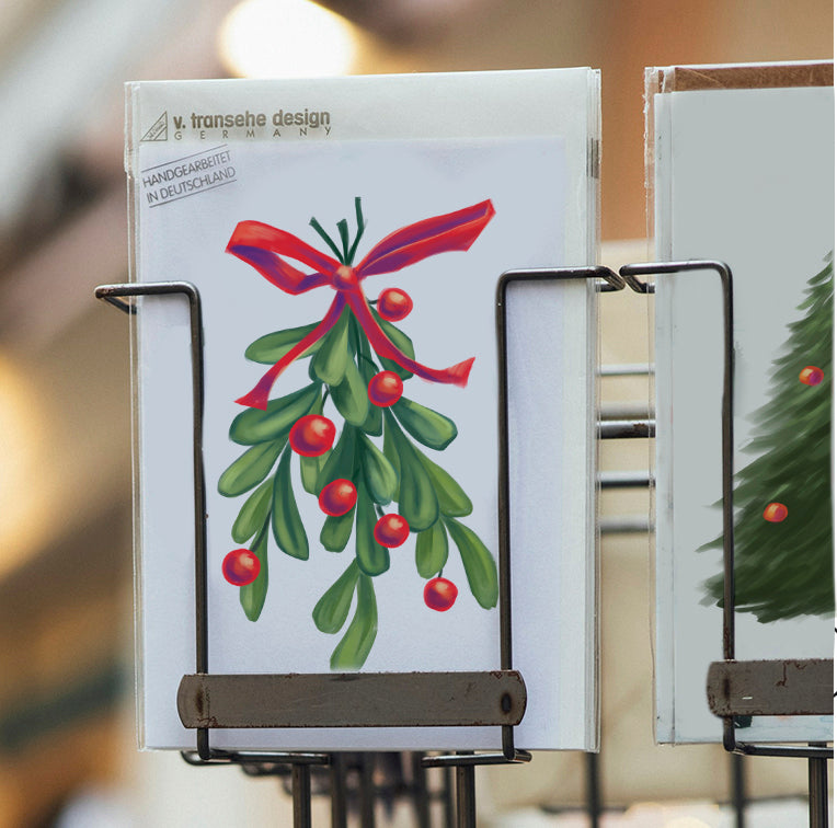 La ilustración es un muérdago con un lazo rojo. El interior de las tarjetas es en blanco. Las tarjetas son neutras, por lo que pueden utilizarse cualquier año y para cualquier religión.